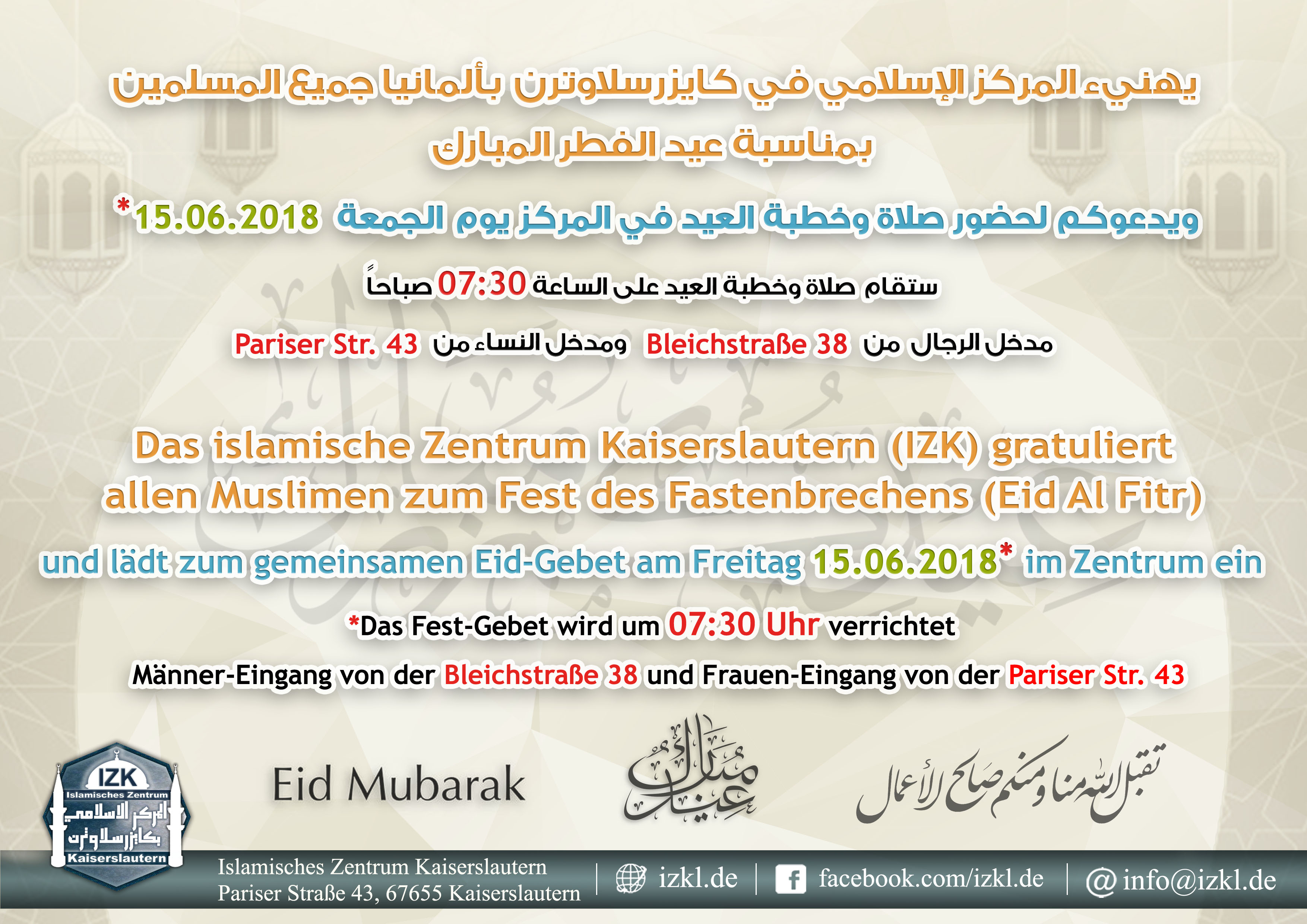 Das islamische Zentrum Kaiserslautern (IZK) gratuliert allen Muslimen zum Opferfest (Eid Al Adha) und lädt zum gemeinsamen Eid-Gebet am Montag 12.09.2016* im Zentrum ein.