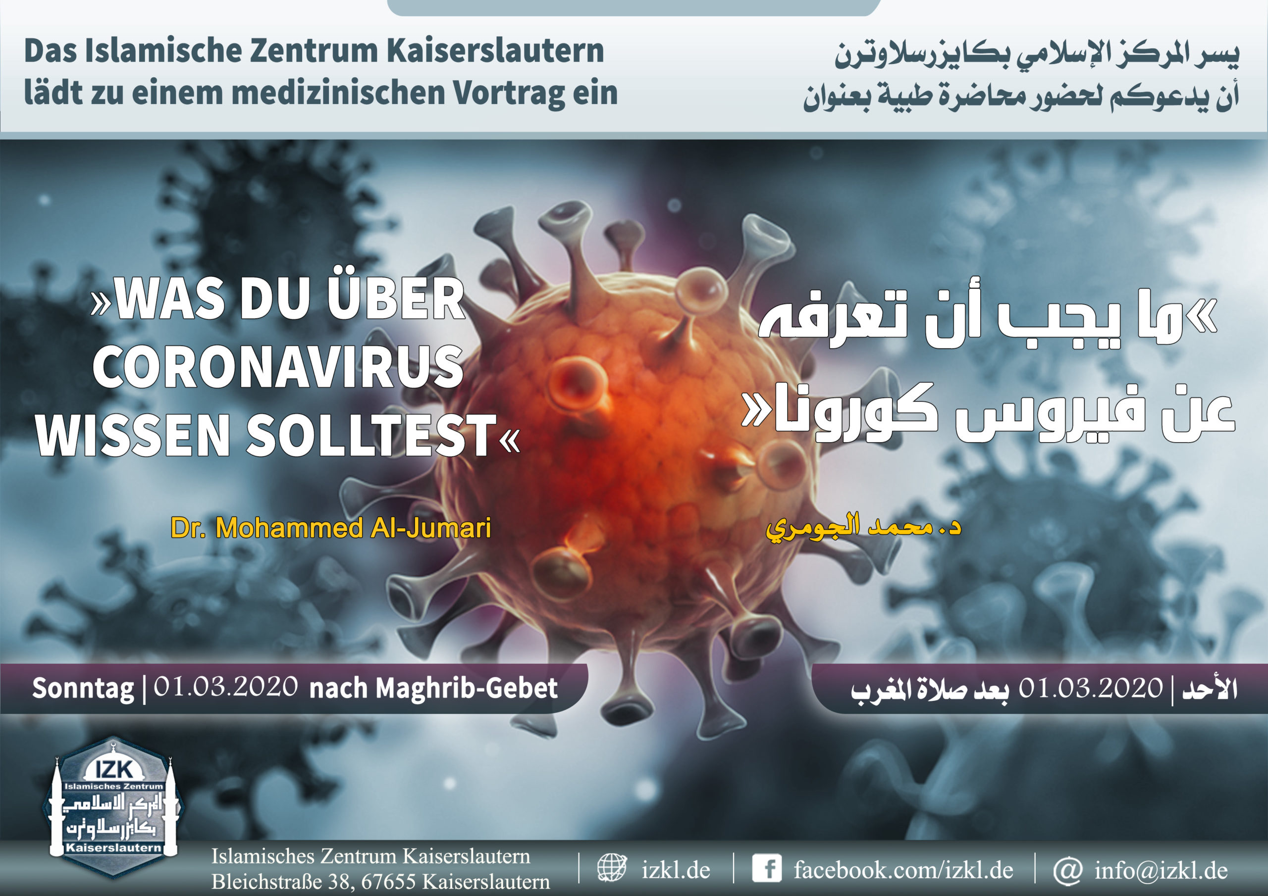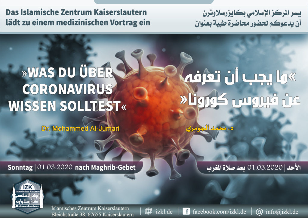Was du über coronavirus wissen solltest | ما يجب أن تعرفه عن فيروس كورونا 25. Februar 2020 Ähnliche Beiträge Wichtige Mitteilung – إعلان عام DIE WIEDERÖFFNUNG DER MOSCHEE – 04.09.2020 – إعادة فتح المسجد EID AL ADHA (OPFERFEST) 2020-1441 عيد الأضحى Die Öffnung der Moschee und Schutzmassnahmen – فتح المسجد وتدابير وقائية